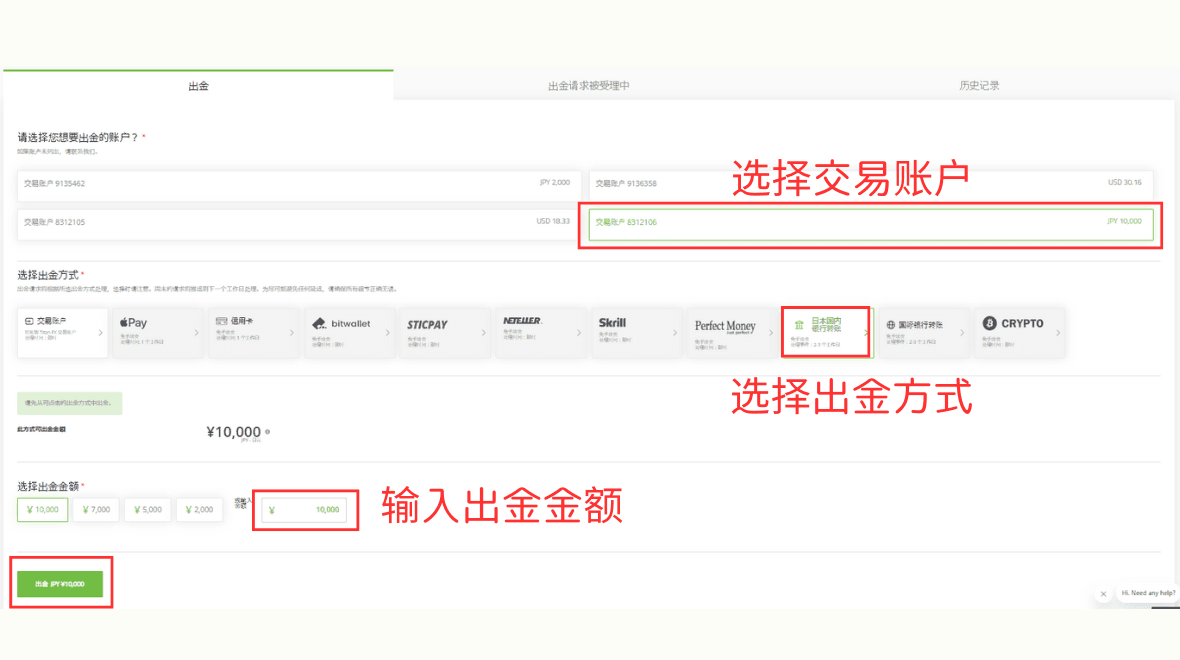In the withdrawal page, first select the account you wish to withdraw from. Then select the withdrawal method. Choose "Local Bank Transfer" and enter the withdrawal amount. Finally, click "Withdraw."