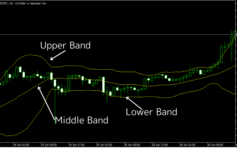Bollinger Bands consist of three main bands, the middle band, upper band, and lower band. These bands dynamically reflect market changes through the combination of moving averages and price volatility.