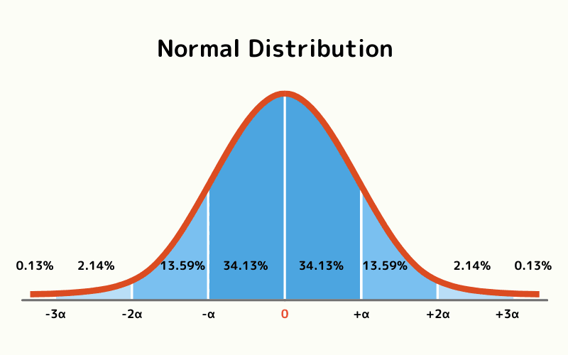 •Within three standard deviations (α): About 99.8% (34.1% + 34.1% + 15.59% + 13.59% + 2.14% + 2.14%) of normally distributed data will fall within three standard deviations.