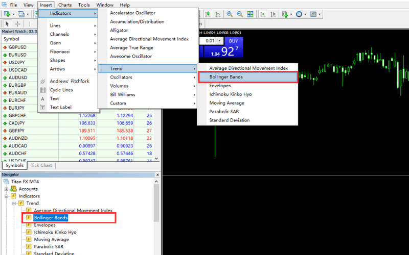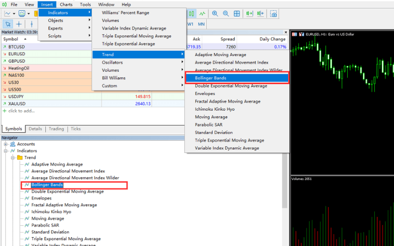 3.Click on the menu bar "Insert" - "Indicators" - "Trend" - "Bollinger Bands"; or click on the "Indicators" tab in the navigator and select "Trend" - "Bollinger Bands."