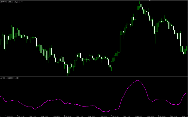 The Bollinger Band Width indicator displays changes in the width of the Bollinger Bands on a sub-chart.