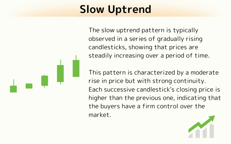 The slow uptrend pattern is typically observed in a series of gradually rising candlesticks, showing that prices are steadily increasing over a period of time.