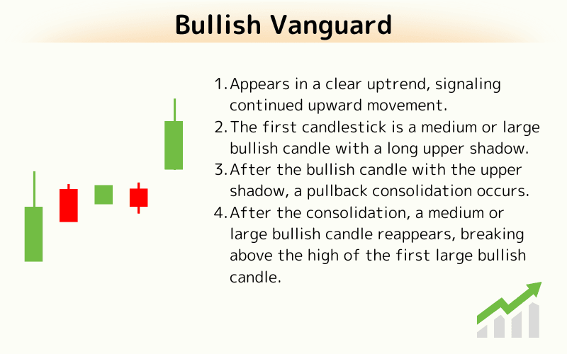 The bullish vanguard pattern appears in the market's uptrend. It starts with a candlestick that has a long upper shadow, signaling active buying but also representing a market test.