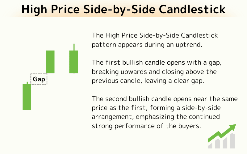 The high price side-by-side candlestick pattern is a crucial signal that appears in an uptrend and is made up of two or more consecutive bullish candlesticks.