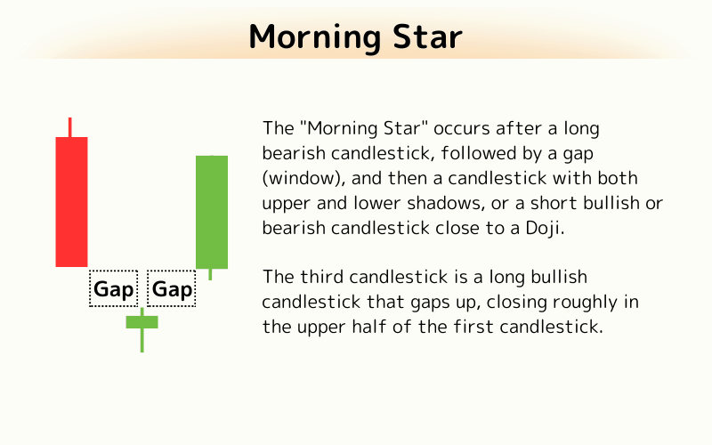 The "Morning Star" occurs after a long bearish candlestick, followed by a gap (window), and then a candlestick with both upper and lower shadows, or a short bullish or bearish candlestick close to a Doji.