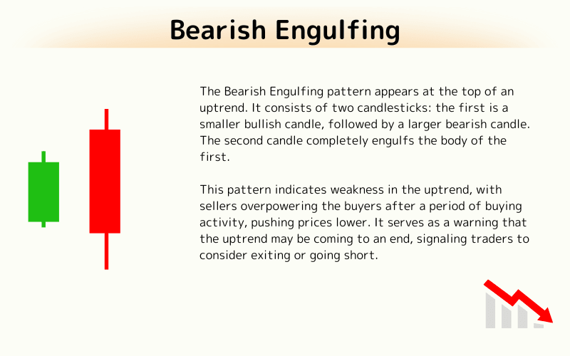 The Bearish Engulfing pattern appears at the top of an uptrend. It consists of two candlesticks: the first is a smaller bullish candle, followed by a larger bearish candle. The second candle completely engulfs the body of the first.