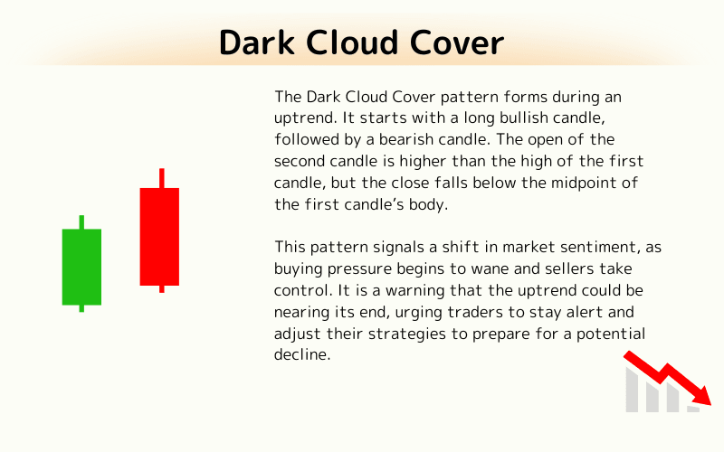 The Dark Cloud Cover pattern forms during an uptrend. It starts with a long bullish candle, followed by a bearish candle. The open of the second candle is higher than the high of the first candle, but the close falls below the midpoint of the first candle’s body.