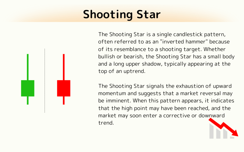 The Shooting Star is a single candlestick pattern, often referred to as an "inverted hammer" because of its resemblance to a shooting target. Whether bullish or bearish, the Shooting Star has a small body and a long upper shadow, typically appearing at the top of an uptrend.