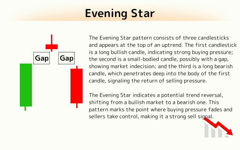 The Evening Star pattern consists of three candlesticks and appears at the top of an uptrend. The first candlestick is a long bullish candle, indicating strong buying pressure; the second is a small-bodied candle, possibly with a gap, showing market indecision; and the third is a long bearish candle, which penetrates deep into the body of the first candle, signaling the return of selling pressure.