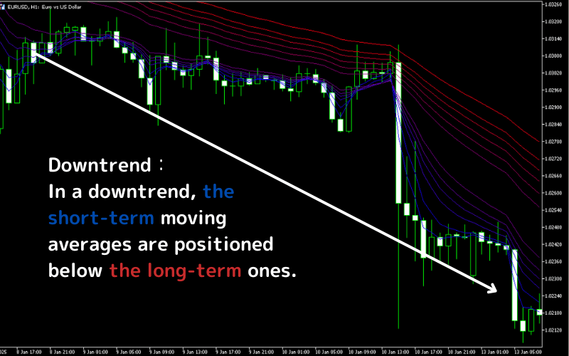 In a downtrend, the short-term moving averages are positioned below the long-term ones. The short-term lines will react first to price declines, falling before the long-term lines, forming a downward trend.