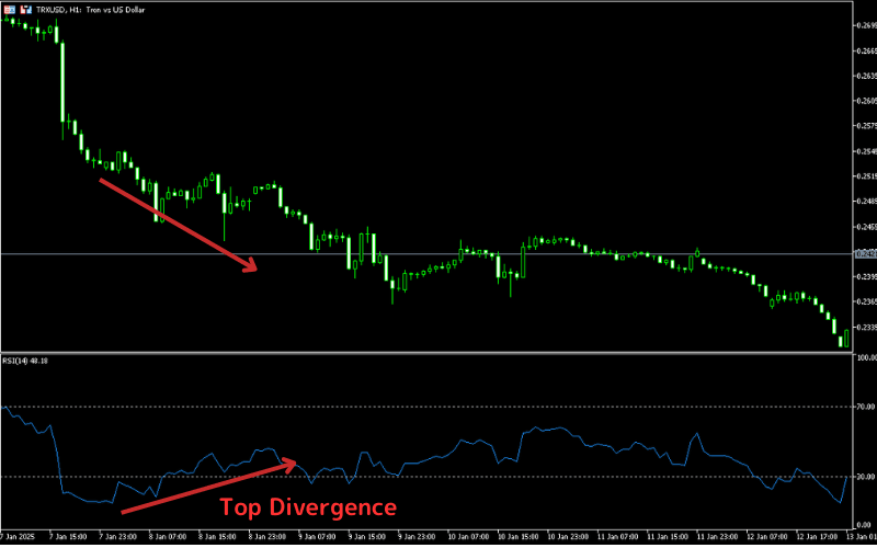 When the market makes a new high but RSI fails to make a new high, it is called a top divergence, indicating a potential trend reversal to the downside.