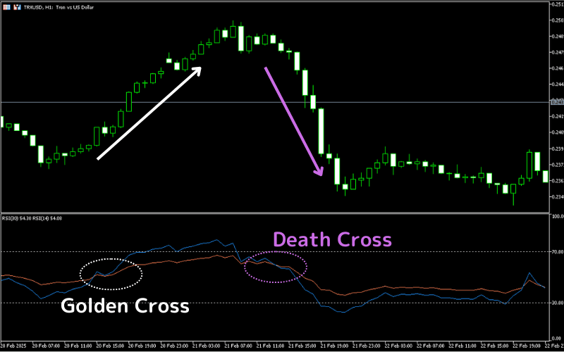Golden Cross and Death Cross refer to signals generated when two different-period RSI lines cross each other.
