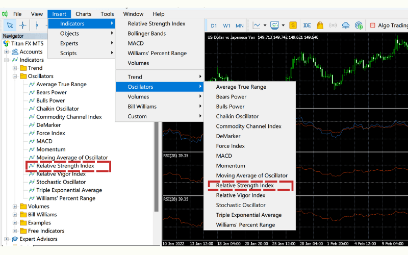 On the MT4 or MT5 trading platform, RSI can be plotted through the following steps: