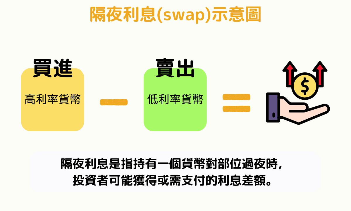 持有貨幣對倉位過夜時,如果買入貨幣的利率高於賣出貨幣的利率,交易者可以獲得利息差收益(也稱為掉期點/swap)。