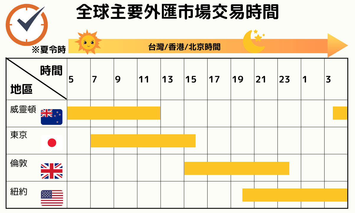 以下為夏令時GMT+8(台北/香港/新加坡)時間的各大市場開閉市時間: