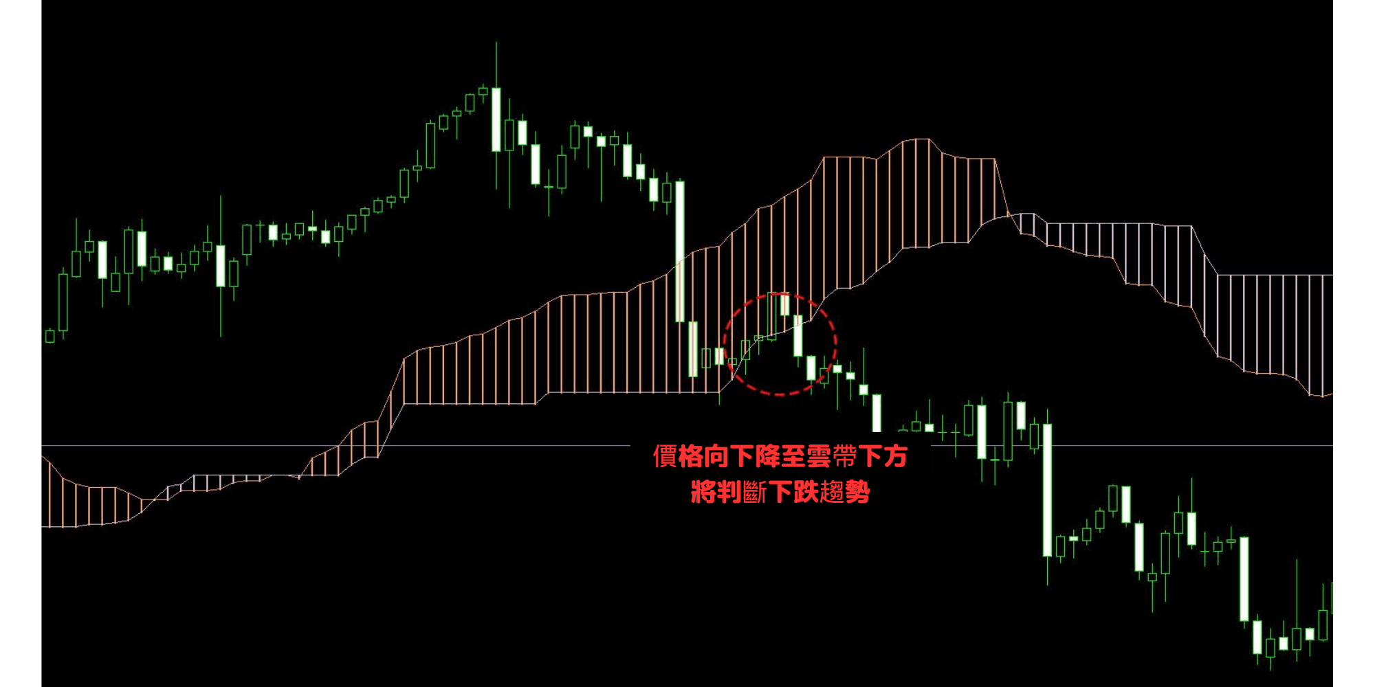 一目均衡表先行帶1與先行帶2之間的區域稱為雲帶,價格向上超過雲帶時,代表上漲趨勢強烈,相對地,當價格向下降至雲帶下方時,將判斷下跌趨勢強烈。