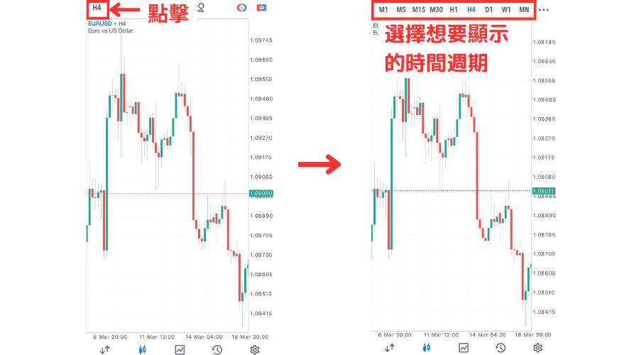 變更時間週期時,點擊圖表左上方的時間週期,這樣就會顯示時間週期一覽,然後點擊想要顯示的時間週期。