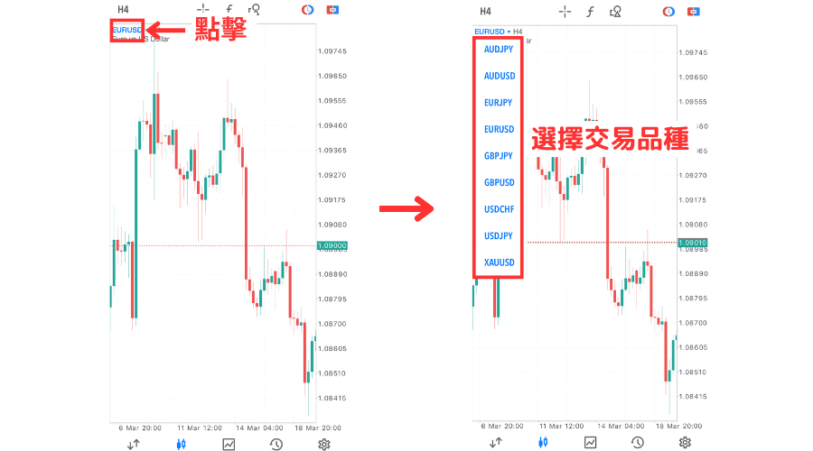 變更交易品種時,點擊圖表左上方的交易品種名稱,這樣就會顯示交易品種一覽,然後點擊想要顯示的交易品種。