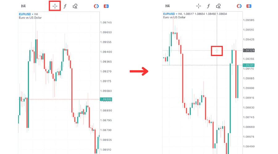 切換十字線模式時,只需要點擊圖表上方的十字圖標就可以。