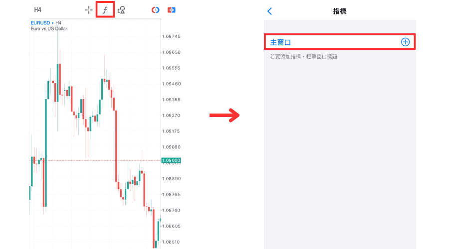 在圖表中添加指標時,點擊圖表上方的指標圖標,在「指標」介面中點擊「主窗口」。