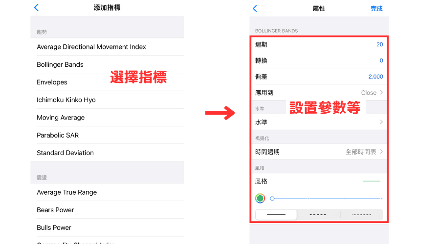 在指標列表中點擊想要添加的指標,設置好參數後,點擊右上方的「完成」,這樣就可以在圖表中顯示指標。
