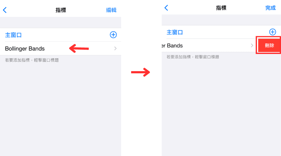 在想要刪除的指標名稱處向左滑動,就會顯示紅色「刪除」按鈕,然後點擊一下就可以了。